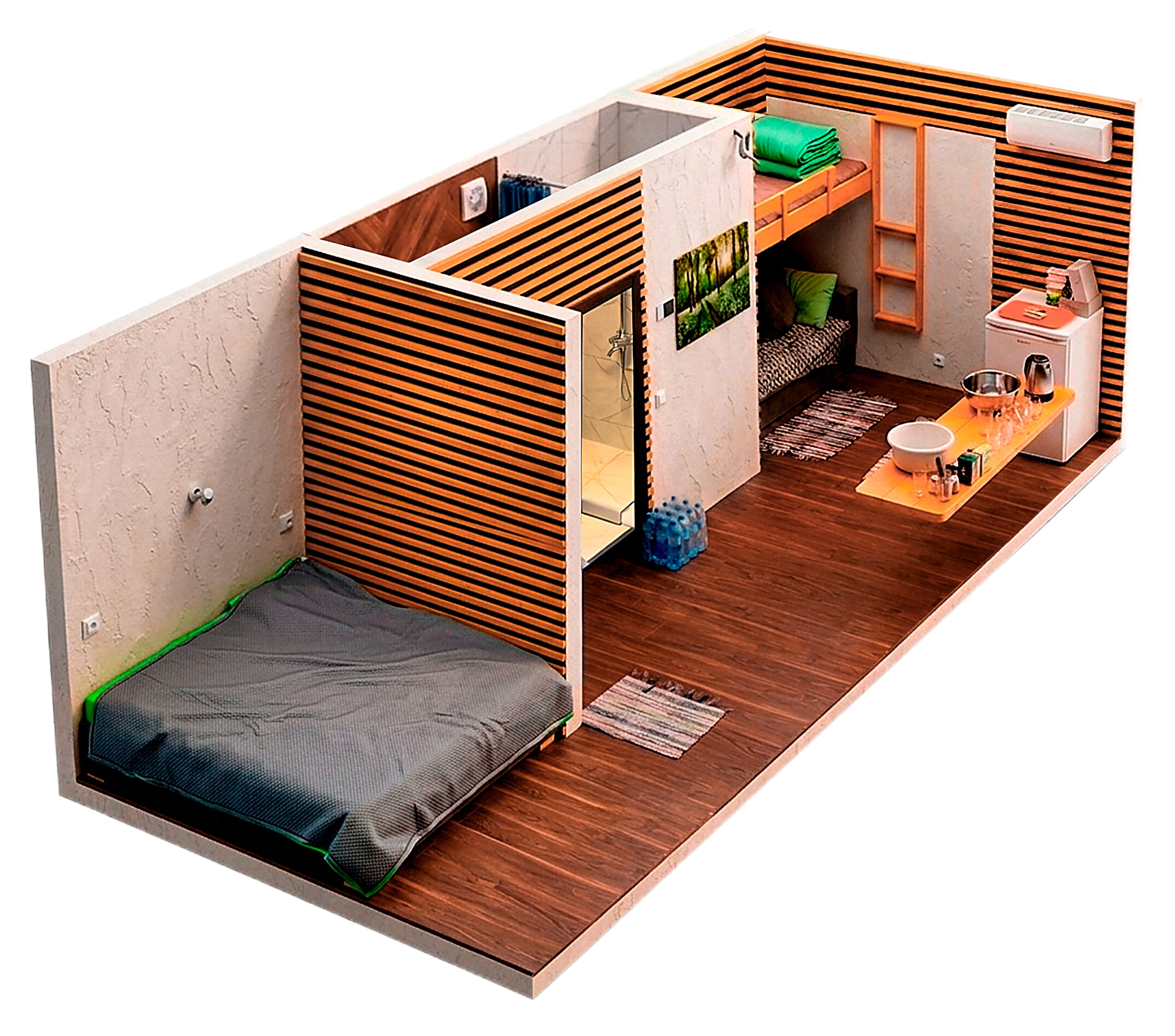 Чайник, посуда, 2х спальная кровать, 2х ярусная детская кровать